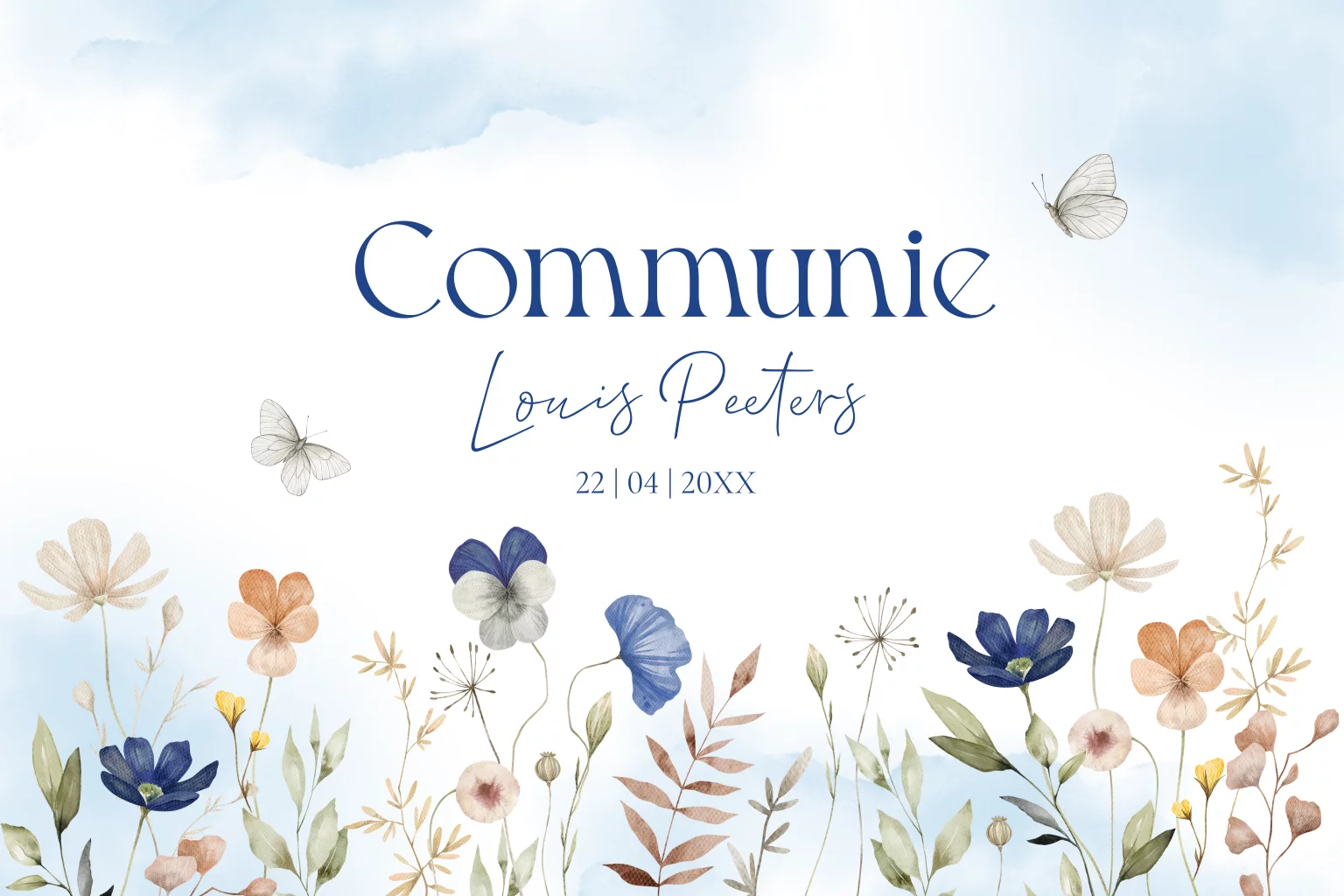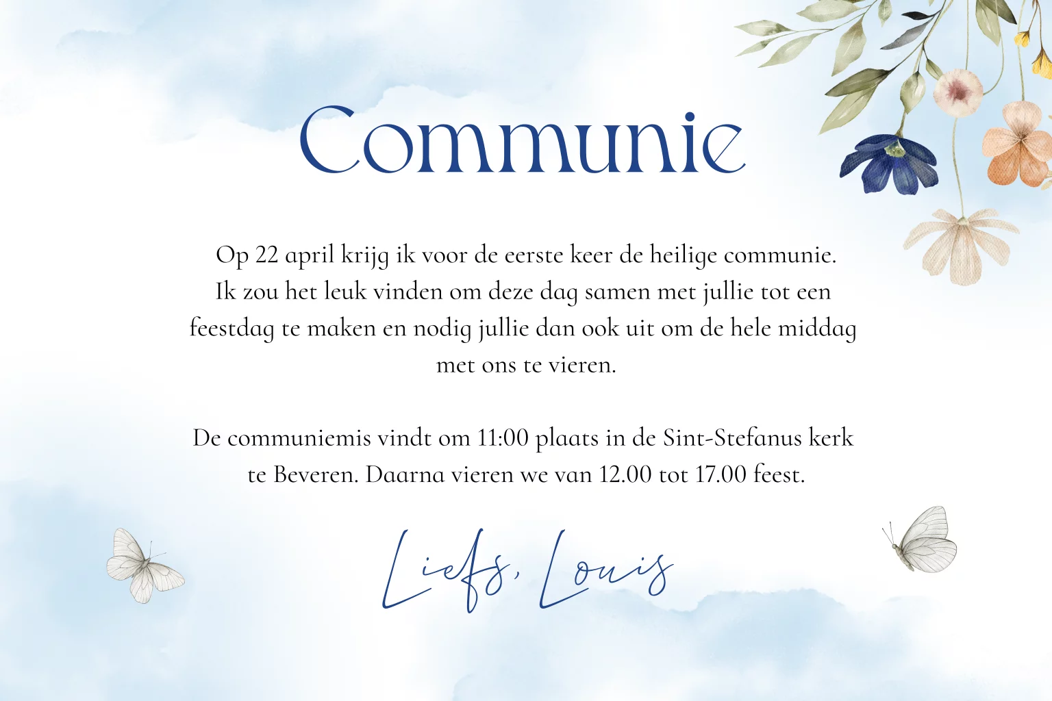 Mooie communiekaart voor een jongen met veldbloemen blauw en vlinders. In de binnenkant kan je een foto plaatsen.