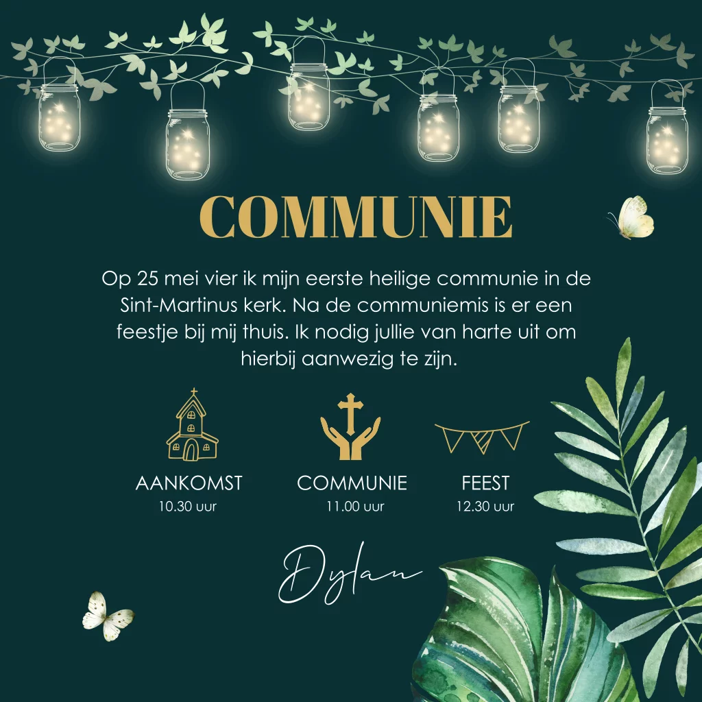 Communie uitnodiging voor een jongen groen met botanisch bladeren, vlinders en lampjes.