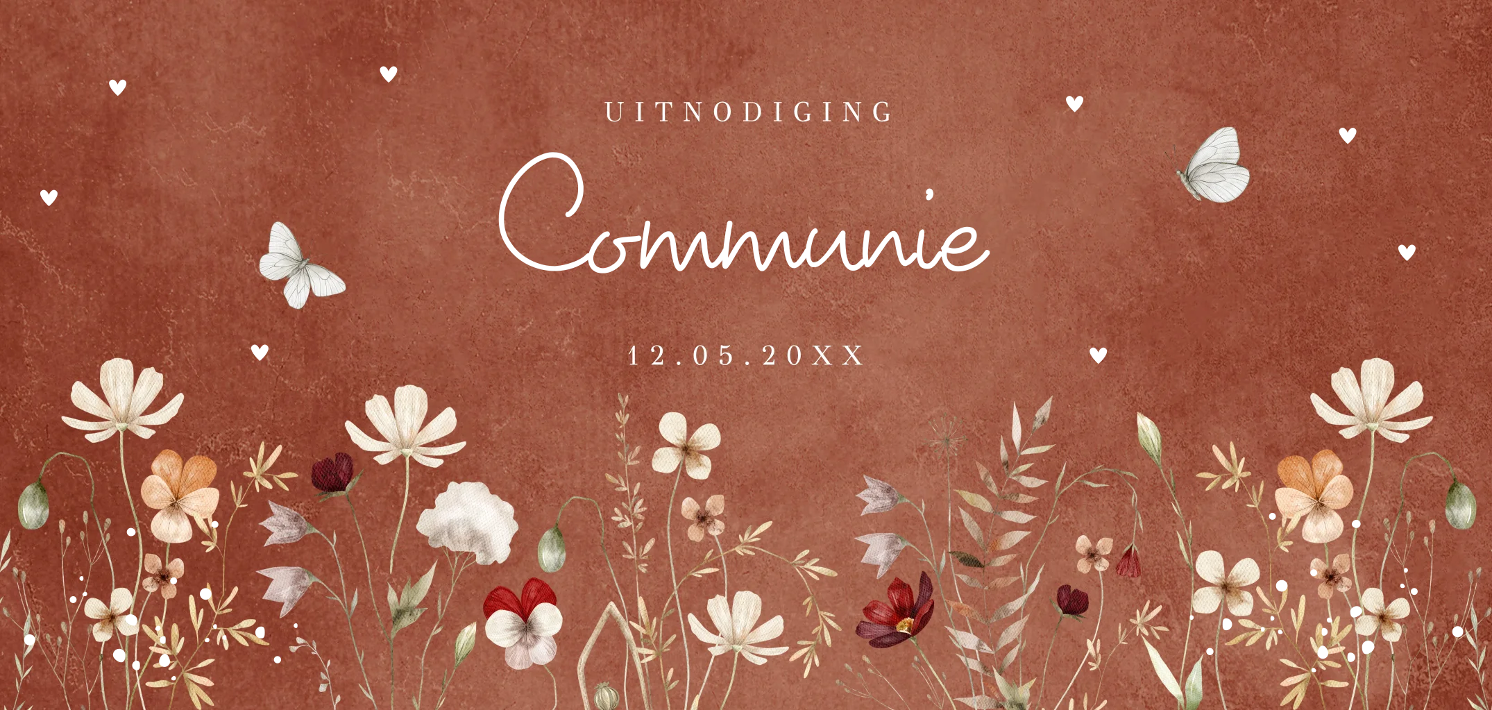 Communiekaart uitnodiging meisje met mooie veldbloemen terraroze en vlinders.