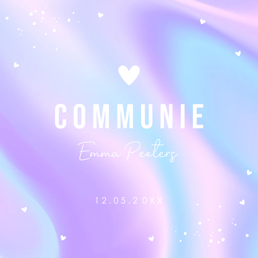Communiekaart uitnodiging voor een meisje met holografische print paars en goudfolie.