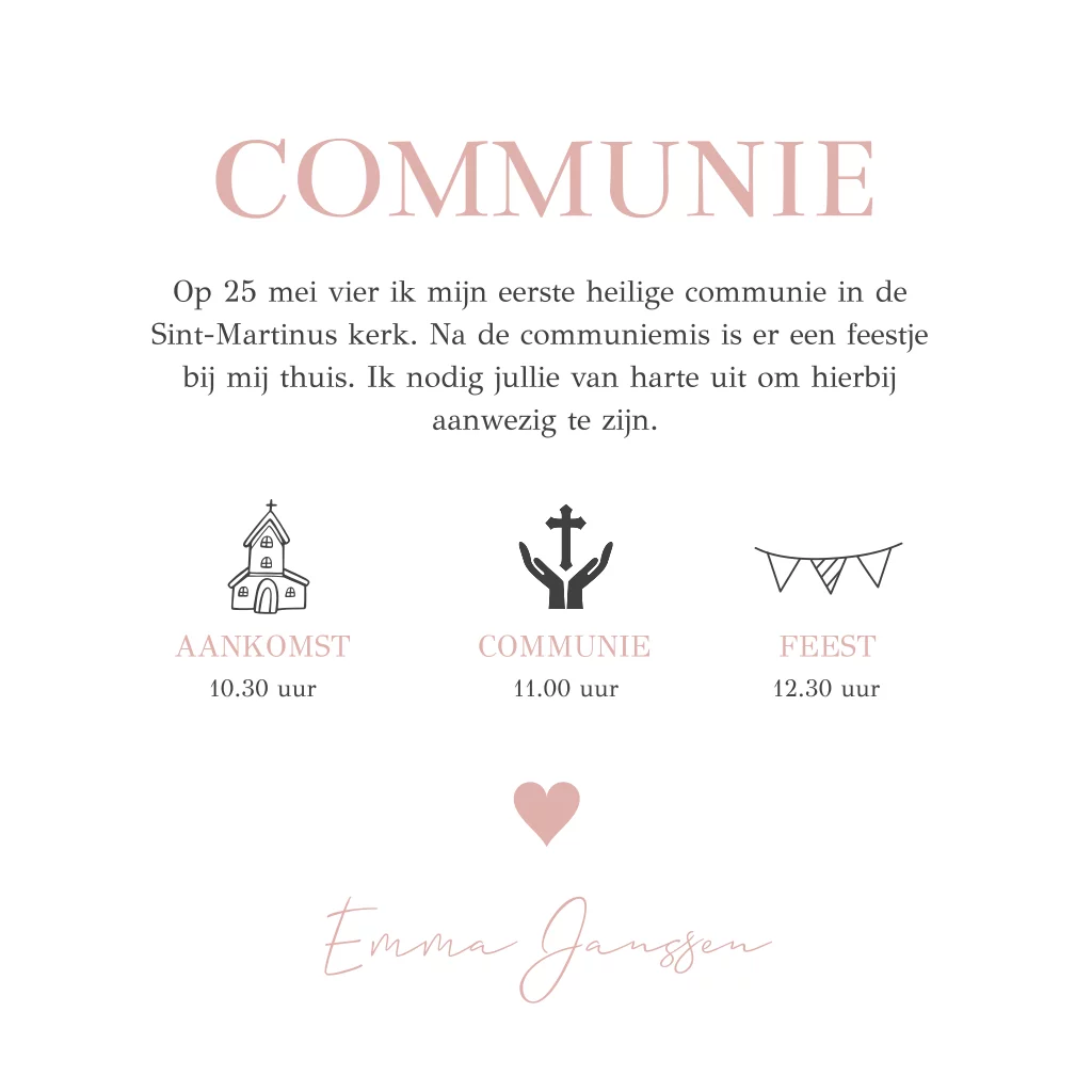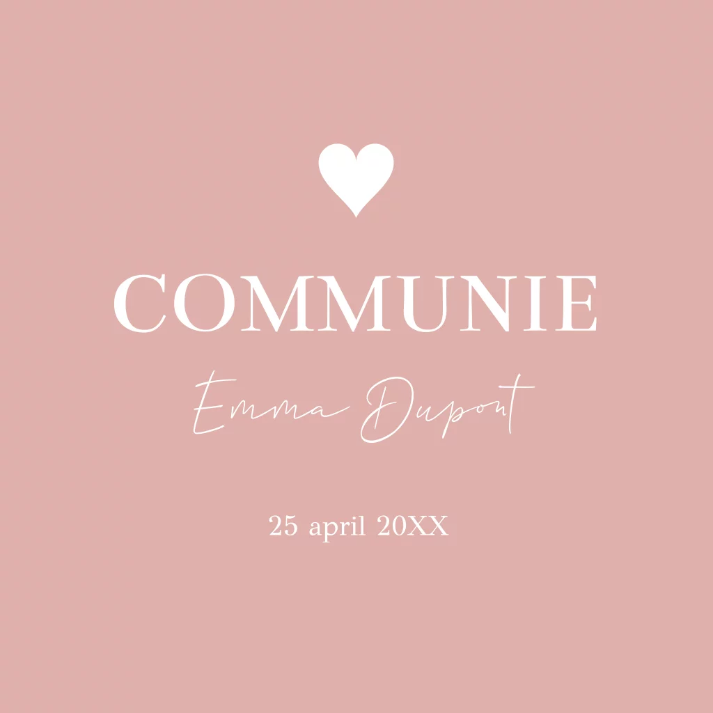 Op zoek naar een prachtige communie uitnodiging voor een meisje met een clean en rustig ontwerp? Dan is deze uitnodiging oudroze met typografie en hartje precies wat je zoekt! Met de mogelijkheid om de kleuren aan te passen naar jouw wensen, kun je deze uitnodiging helemaal personaliseren voor deze speciale gelegenheid.