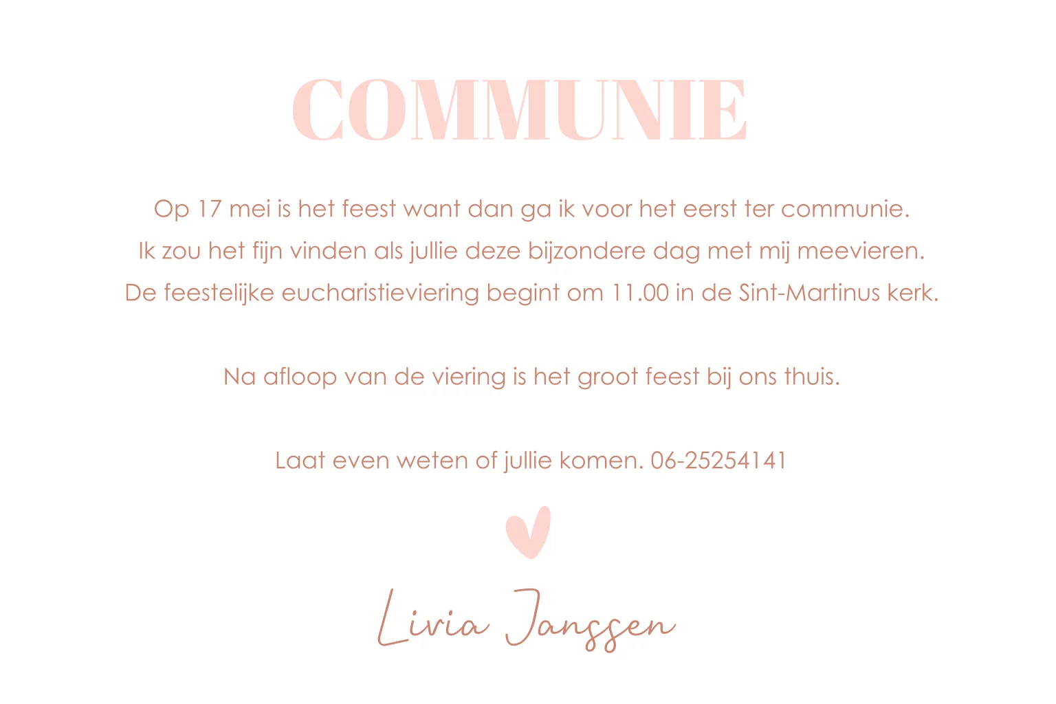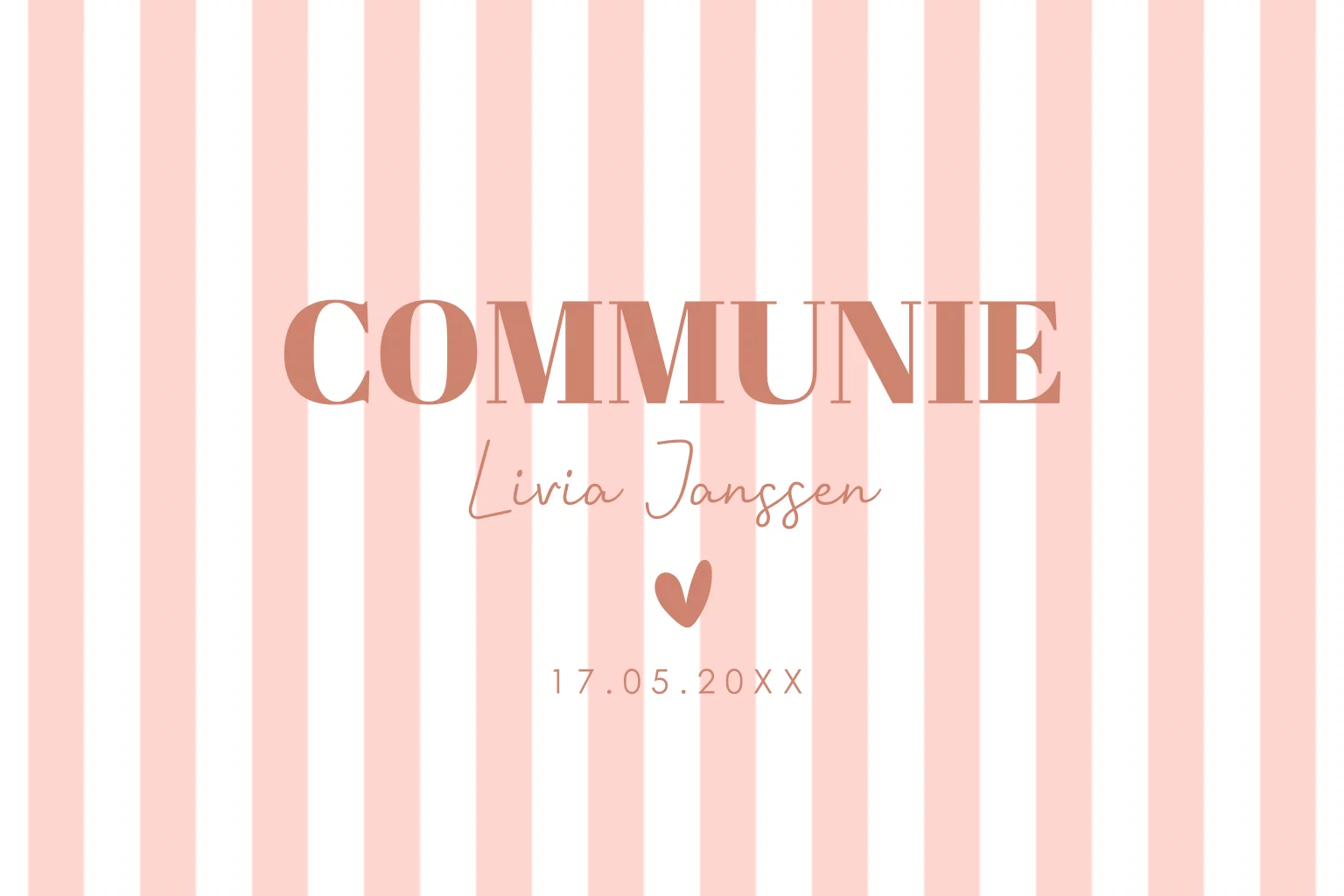 Communie uitnodiging voor een meisje met roze strepen en hartje. Pas de kleuren naar wens aan.