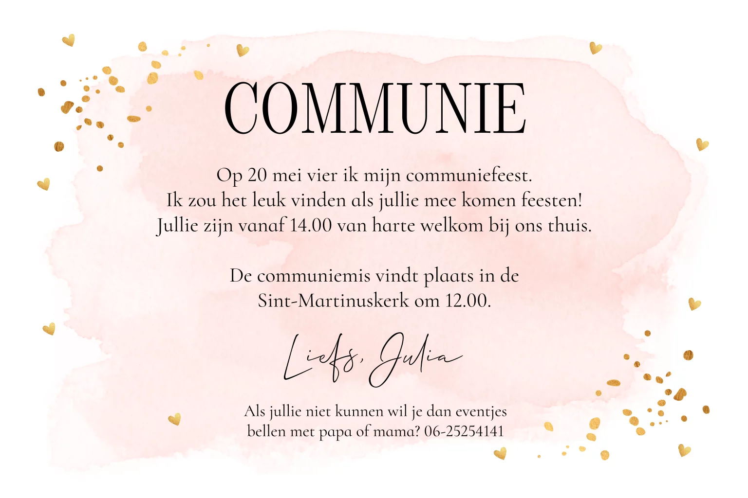 Communiekaart uitnodiging voor een meisje roze met watercolour goudlook hartjes.