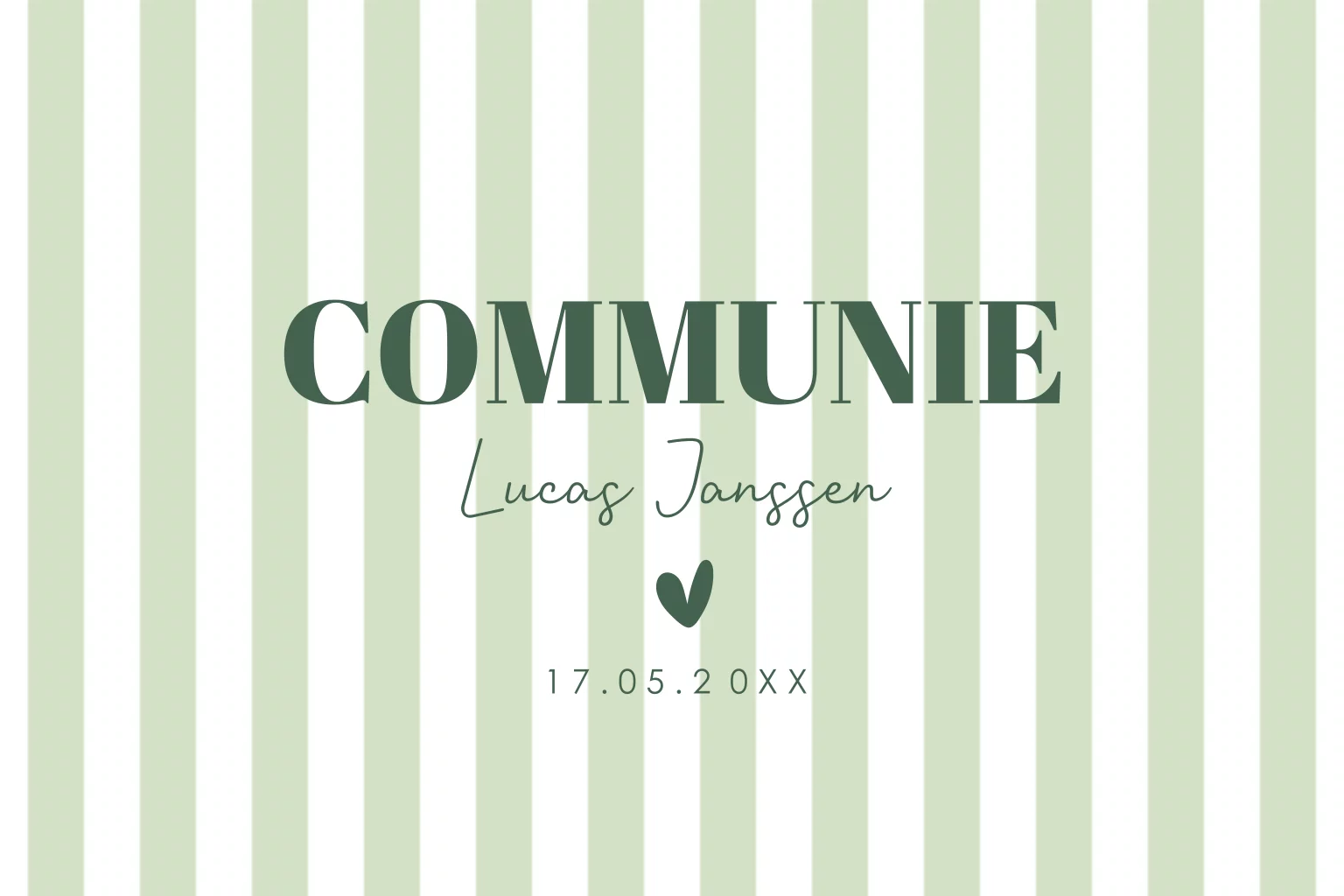 Communie uitnodiging voor een jongen met groene strepen en hartje. Pas de kleuren naar wens aan.