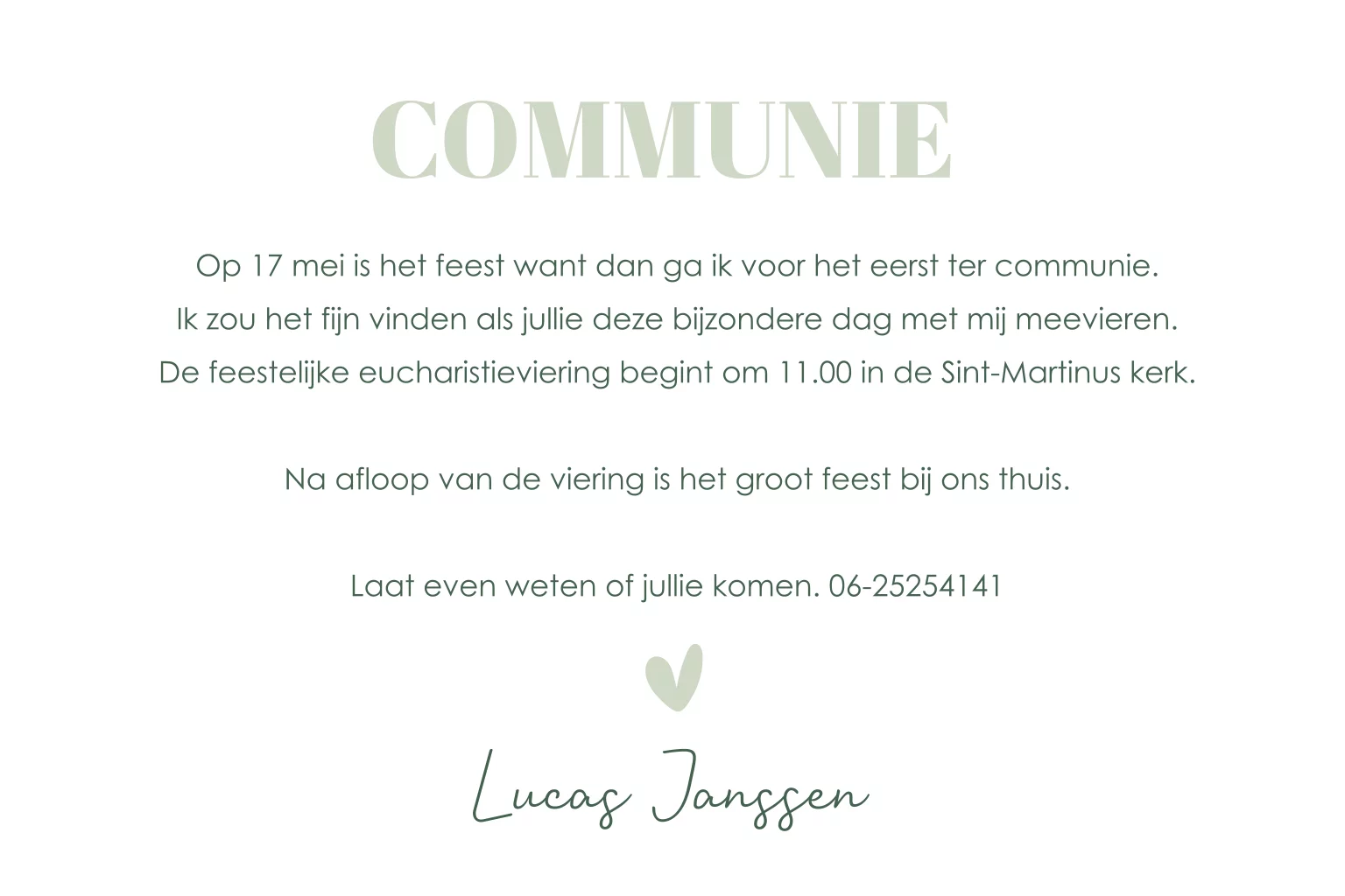 Communie uitnodiging jongen groen strepen modern hartje