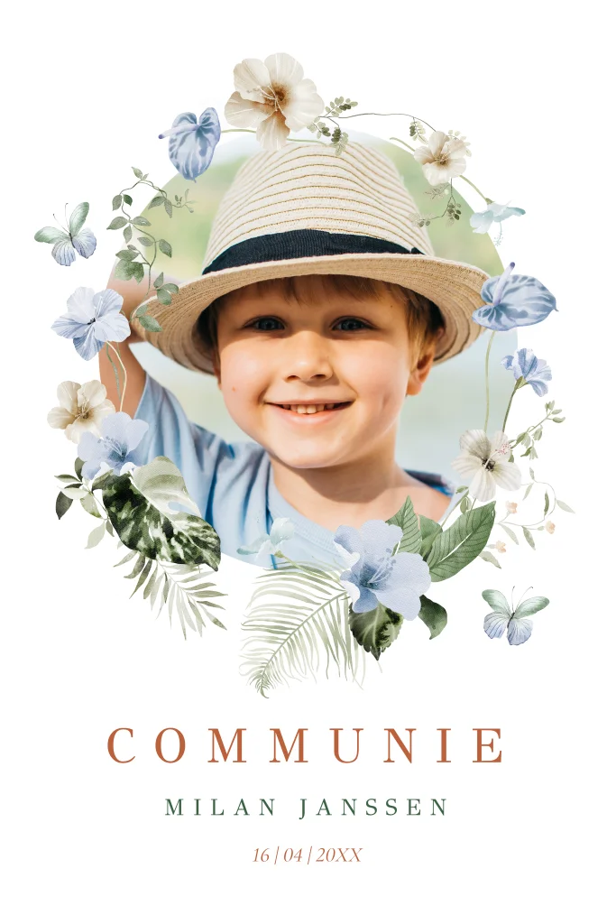 Communie uitnodiging jongen met foto boog bloemen blauw vlinders
