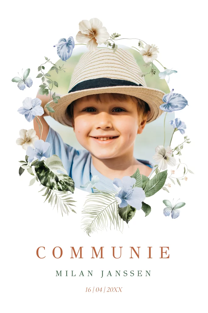 Communiekaart uitnodiging wit voor een jongen met foto, boog vorm, bloemen blauw, groene bladeren en vlinders.