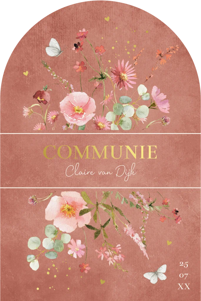 Communiekaart voor een meisje in boog vorm met aquarel roze bloemen, vlinders en foliedruk. Nodig jullie gasten uit met deze prachtige communie uitnodiging!