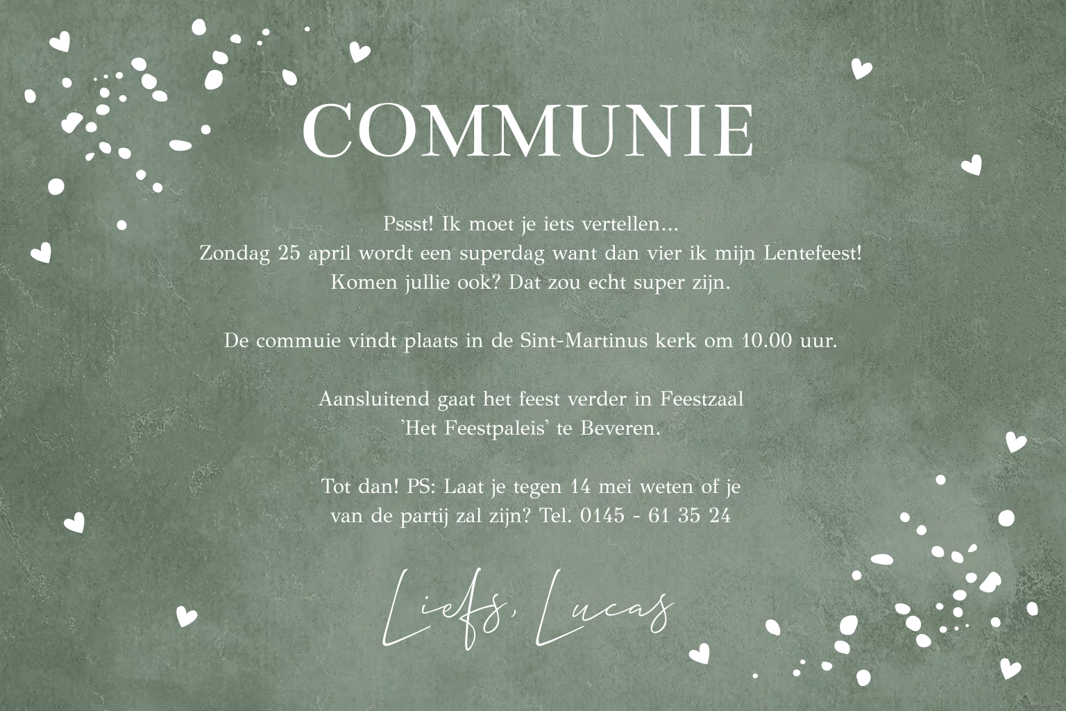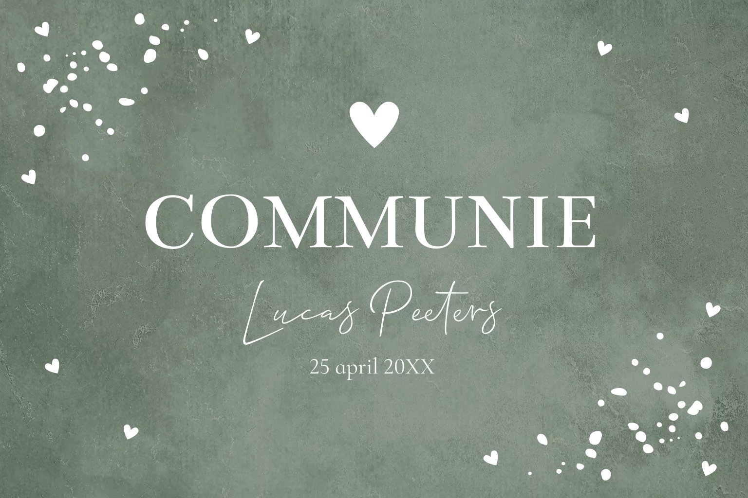 Stijlvolle communiekaart groen voor een jongen met goudfolie. In de binnenkant kan je een foto plaatsen.