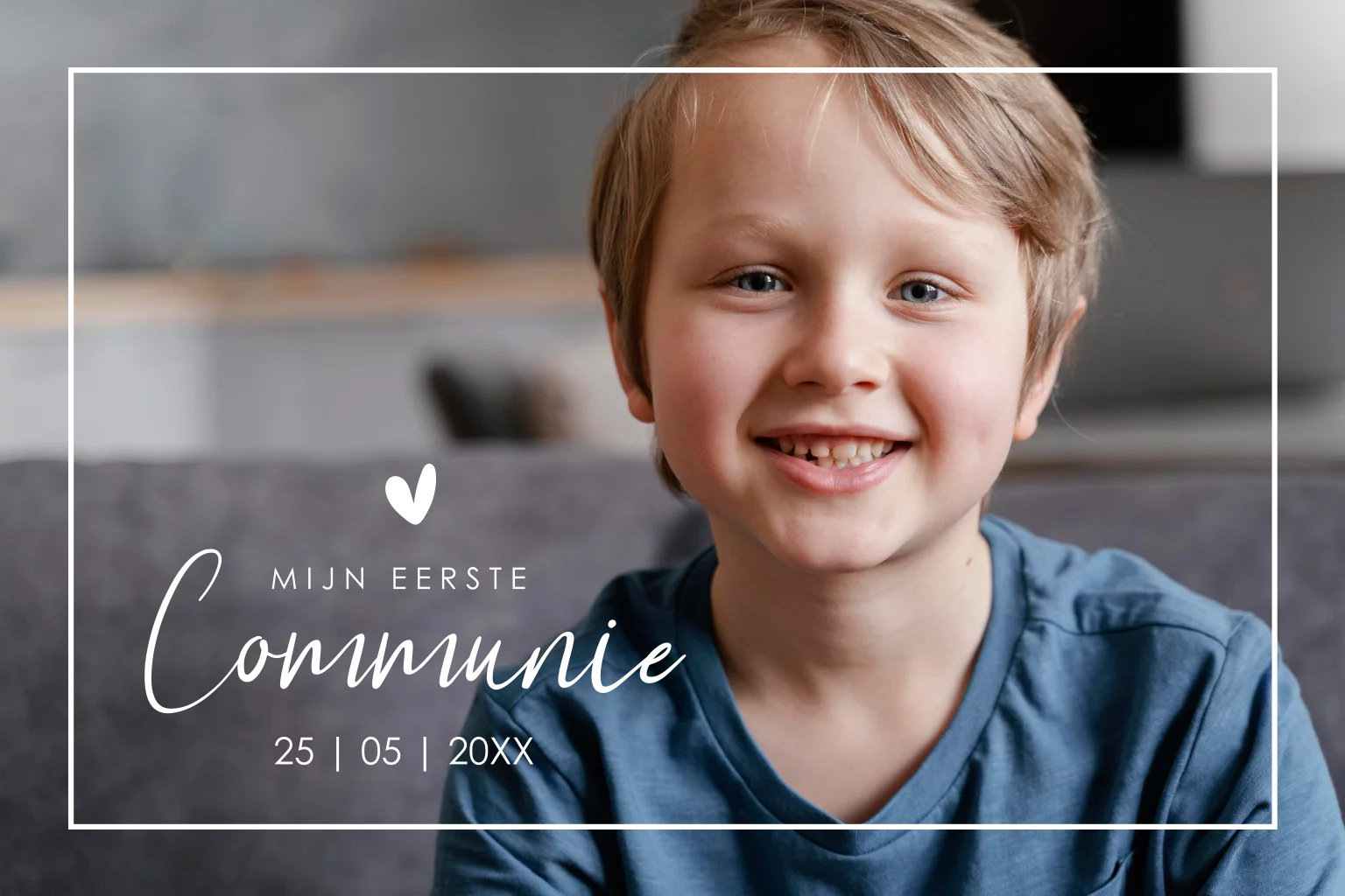 Communiekaart uitnodiging voor een jongen met eigen foto en zilverfolie kader.