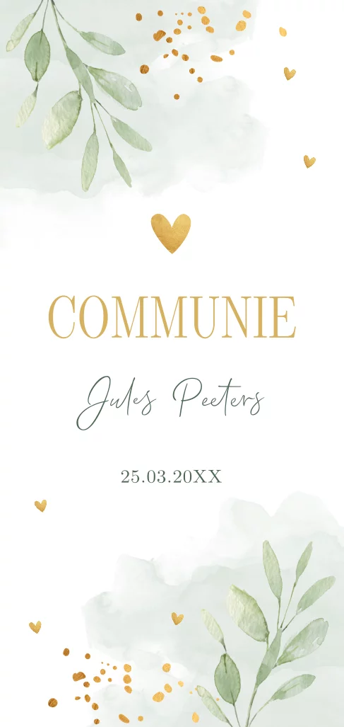 Communiekaart uitnodiging voor een jongen groen met waterverf, bladeren en goudlook.