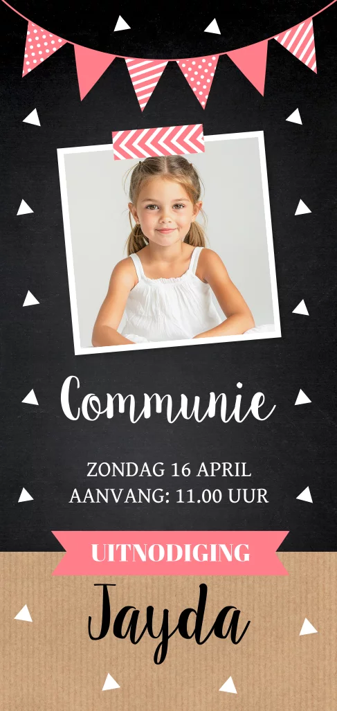 Uitnodiging communie meisje langwerpig zwart roze met eigen foto, driehoekjes en slinger.