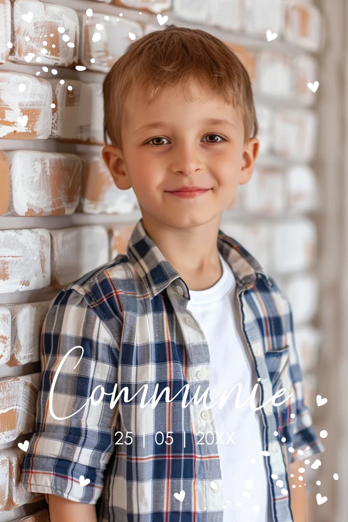 Stijlvolle communiekaart rechthoekig voor een jongen met eigen foto, hartjes en goudfolie. Nodig jullie gasten uit met deze prachtige communie uitnodiging!