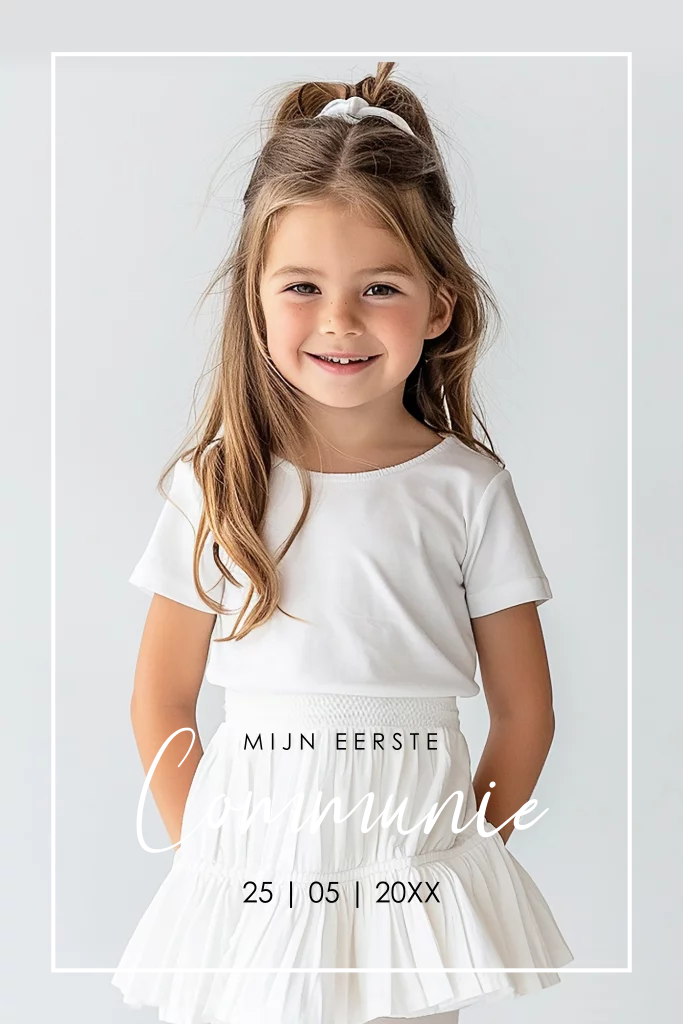 Communiekaart uitnodiging voor een meisje met foto, hartje en zilverfolie kader rechthoekig.