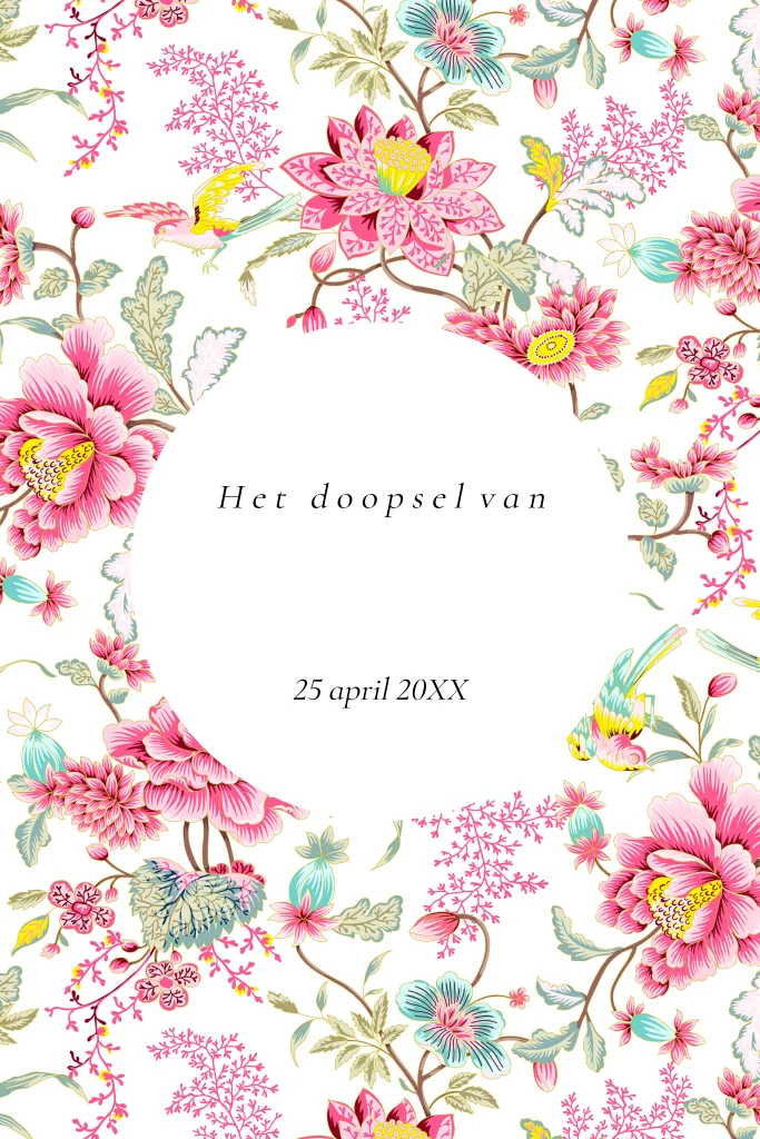 Doopkaart voor een meisje geïllustreerd met mooie roze bloemen patroon en goudfolie.