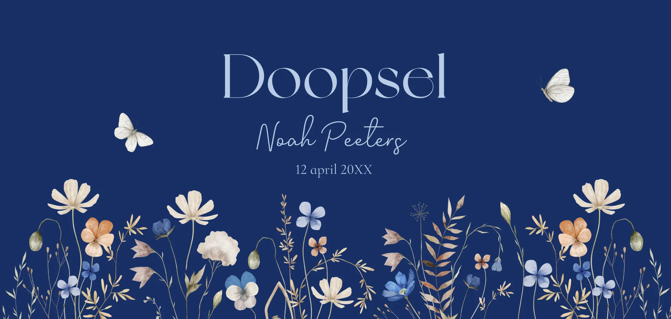 Doopkaart uitnodiging voor een jongen blauw panorama met mooie veldbloemen en vlinders.