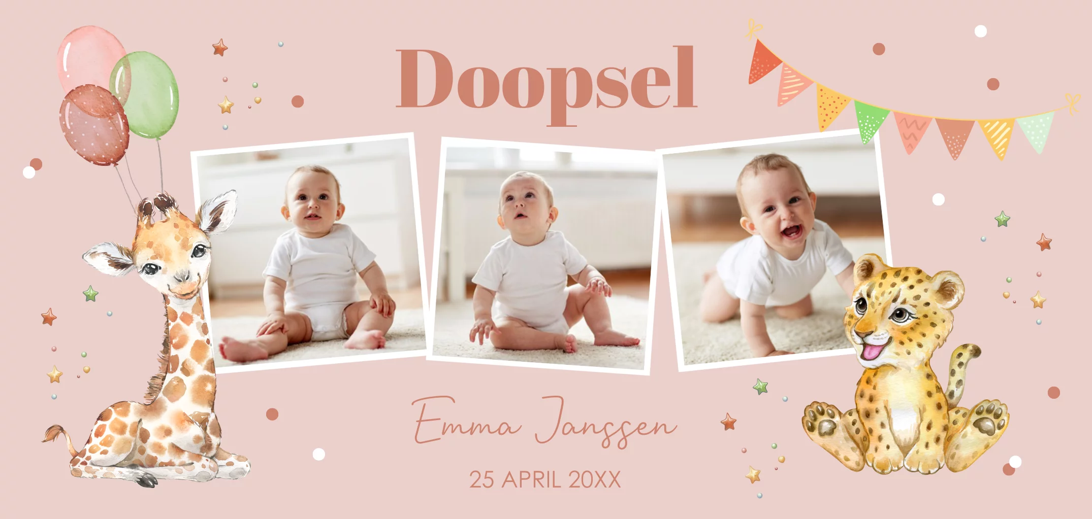 Doopkaart langwerpig roze voor een meisje met fotocollage en safari dieren.
