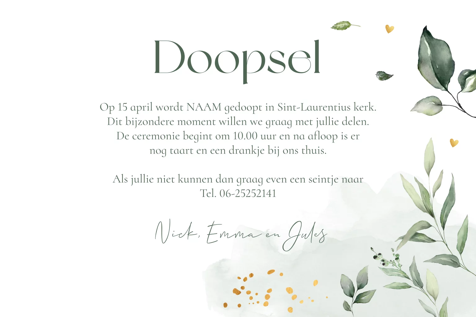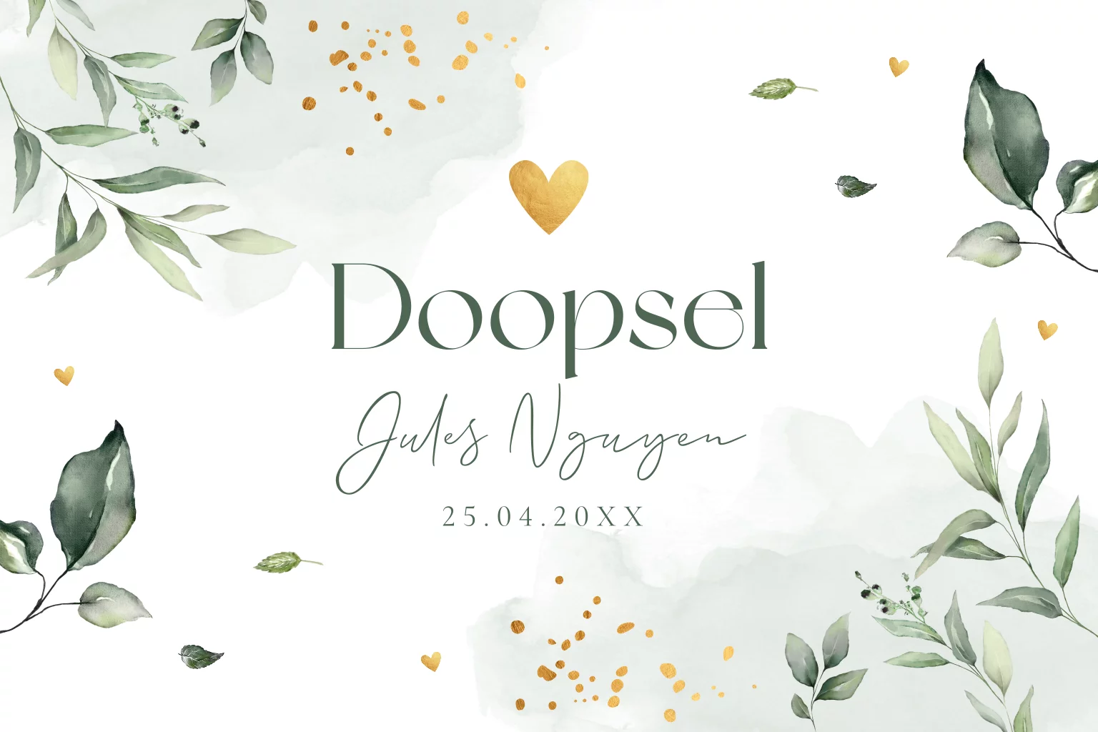 Doop uitnodiging voor een jongen groen met waterverf bladeren en goudlook hartjes. Geen folie!