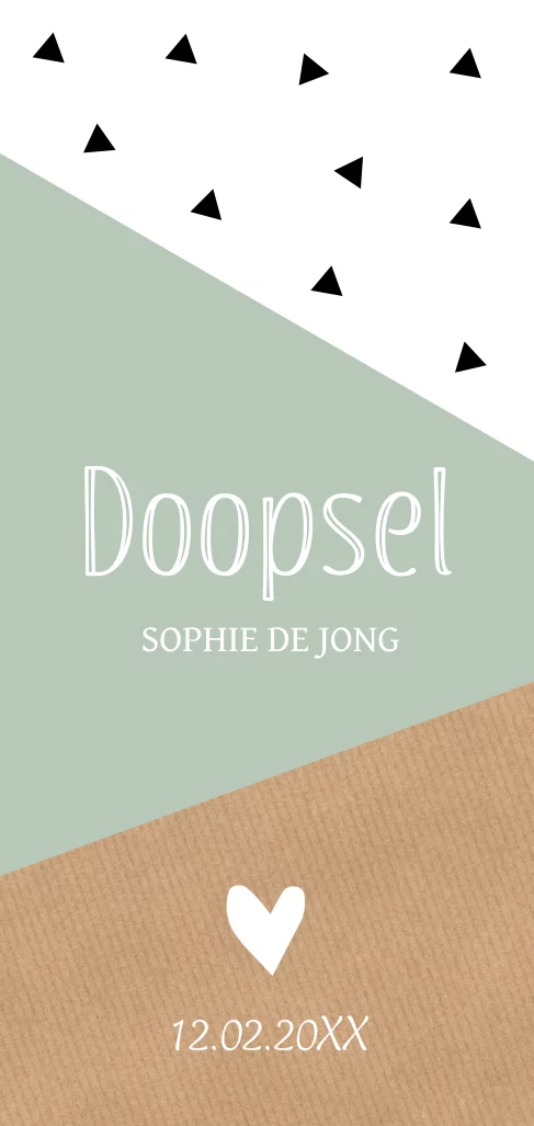 Doopuitnodiging langwerpig voor een jongen met geometrische vlakken, kraft, driehoekjes en hartje.