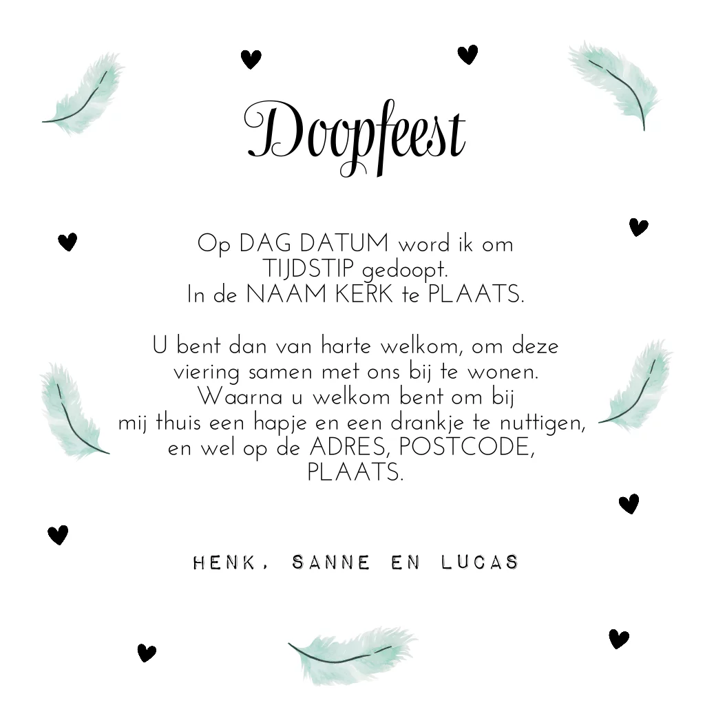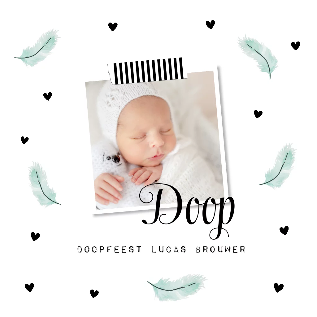 Doop uitnodiging voor een jongen wit met groene veertjes, hartjes en eigen foto.