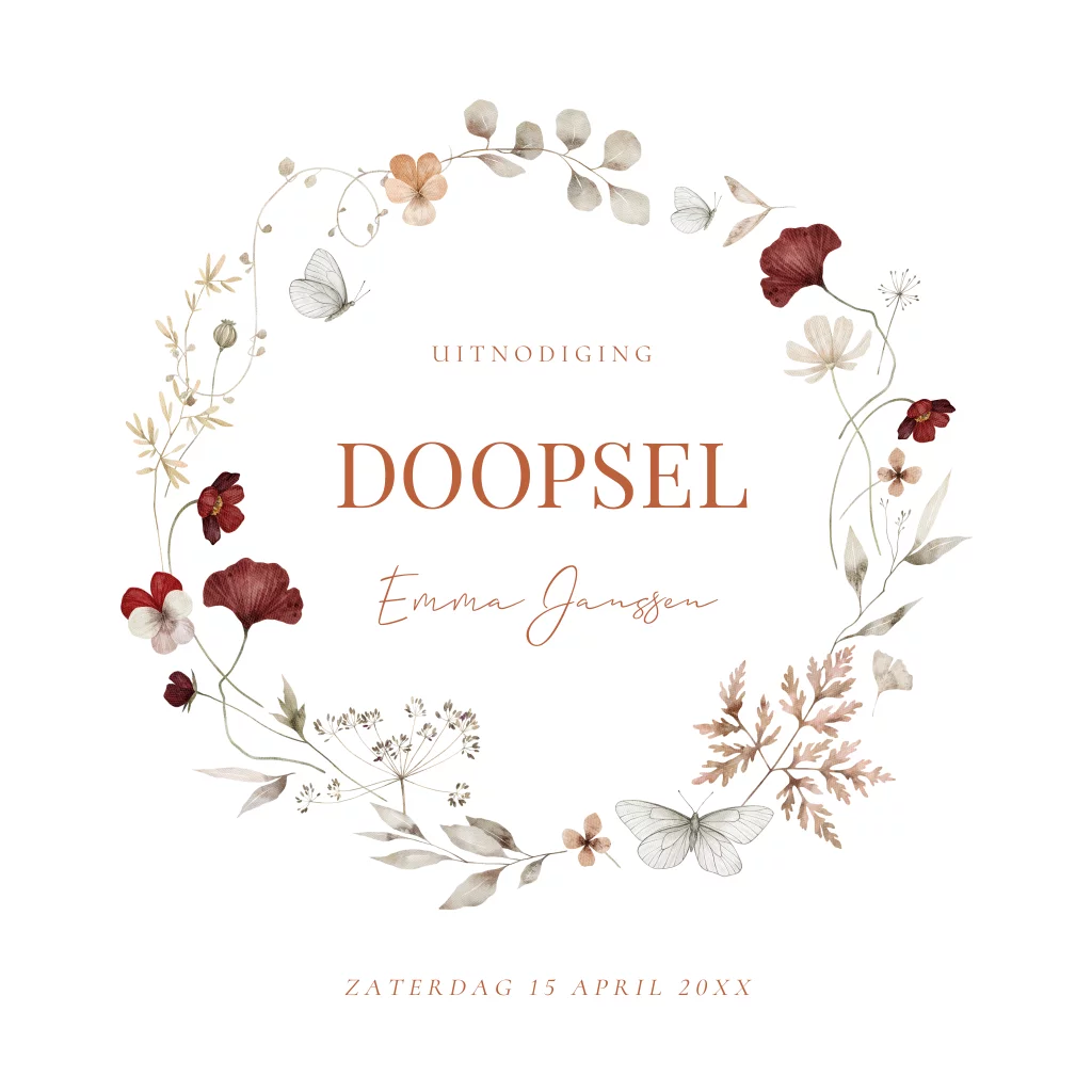 Doopkaart voor een meisje met watercolour bloemenkrans beige met rood.