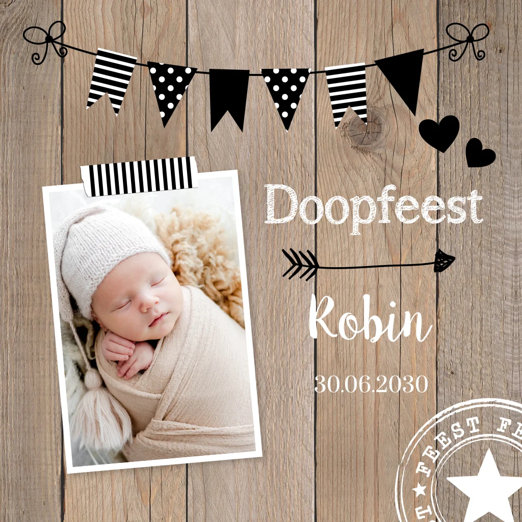 Doop uitnodiging voor een jongen met eigen foto, hout print, zwart wit slinger en stempel.