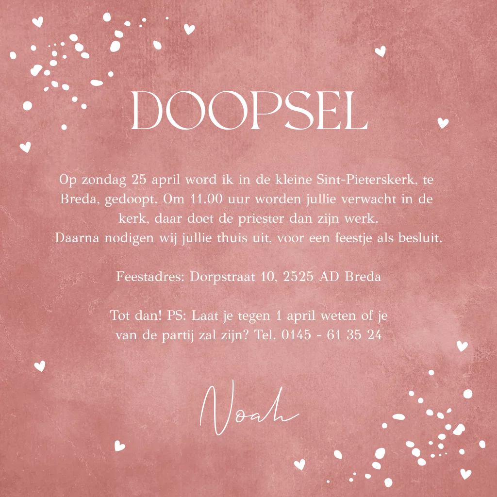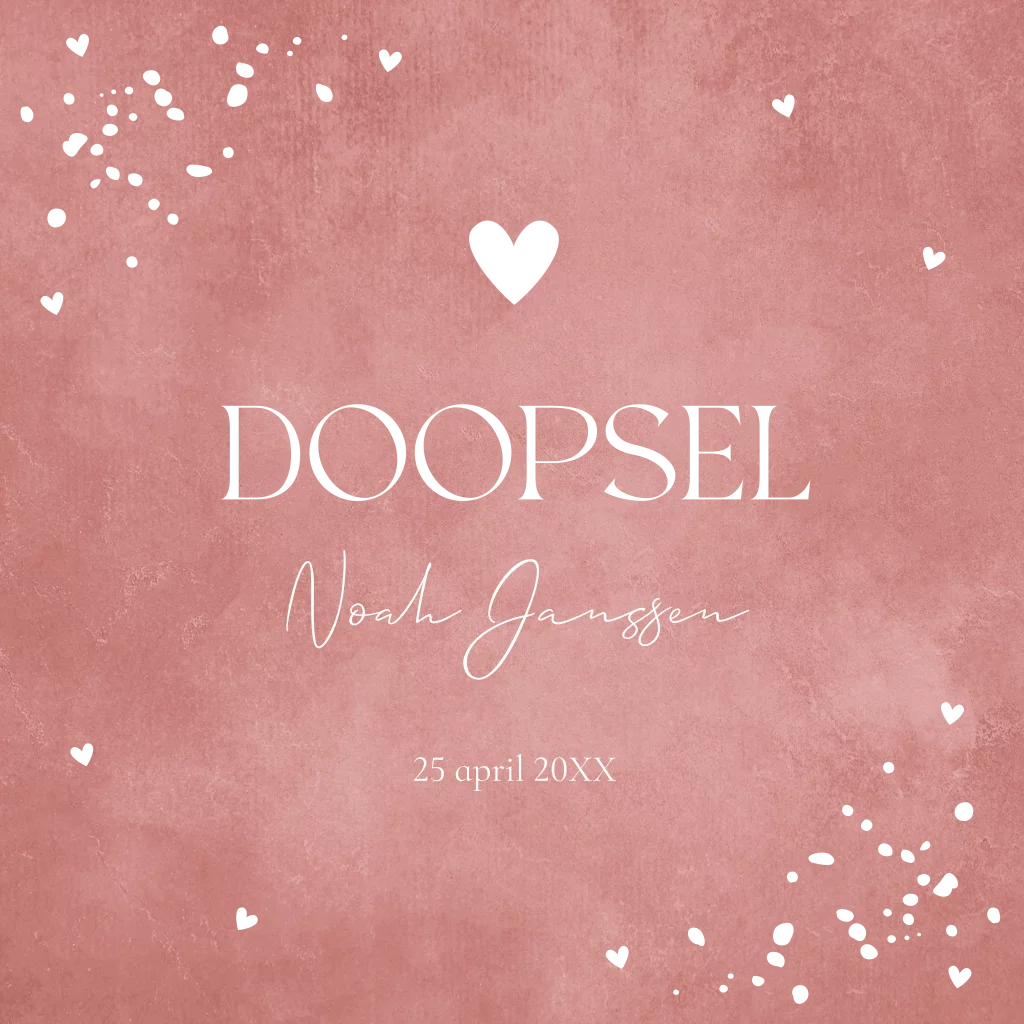 Doopkaart voor een meisje roze met hartjes en goudfolie.