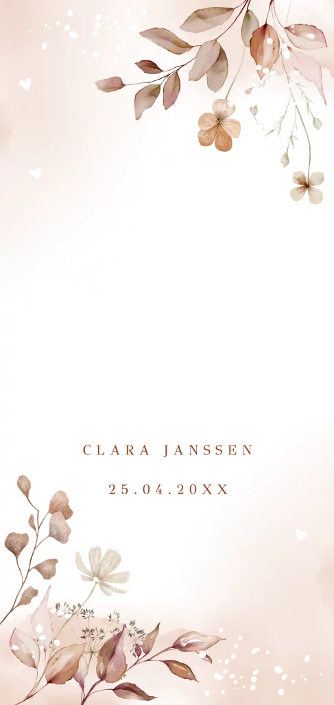 Doopkaart langwerpig voor een meisje met watercolour bloemen terracotta roze en goudfolie.
