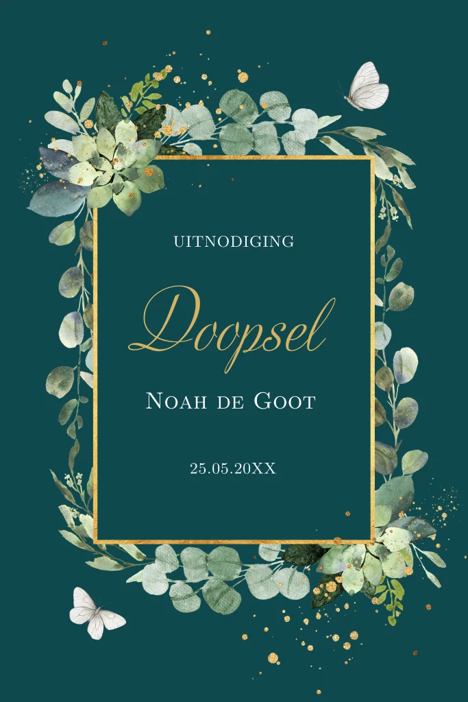 Doop uitnodiging voor een jongen of meisje met botanisch groene bladeren en vlinders.