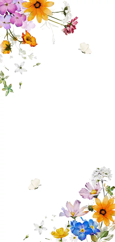 Doop uitnodiging langwerpig wit voor een meisje met zomerse gekleurde bloemen en goudfolie.