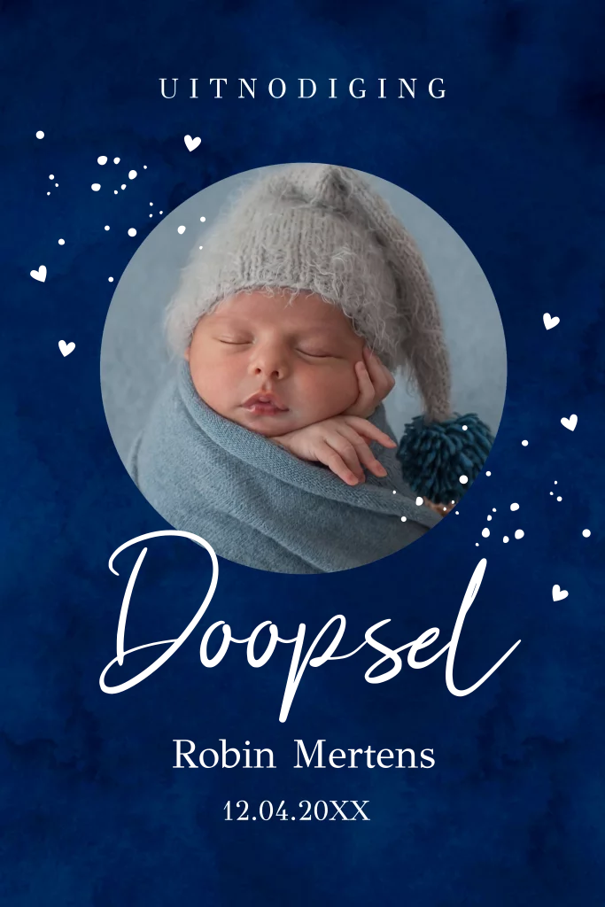 Doop uitnodiging voor een jongen blauw met foto rond, spetters, hartjes en goudfolie.