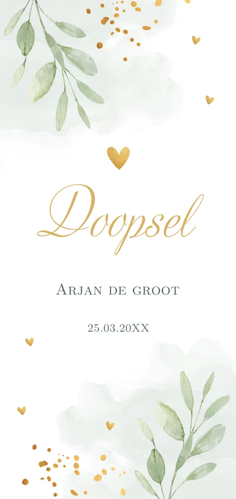 Doopkaart langwerpig groen voor een jongen met waterverf bladeren en goudlook hartjes. Geen folie!
