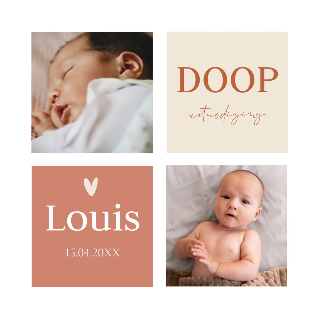 Doopkaart voor een jongen of meisje met foto 's en gekleurde vlakken. Pas de kleur van de vlakken naar wens aan!