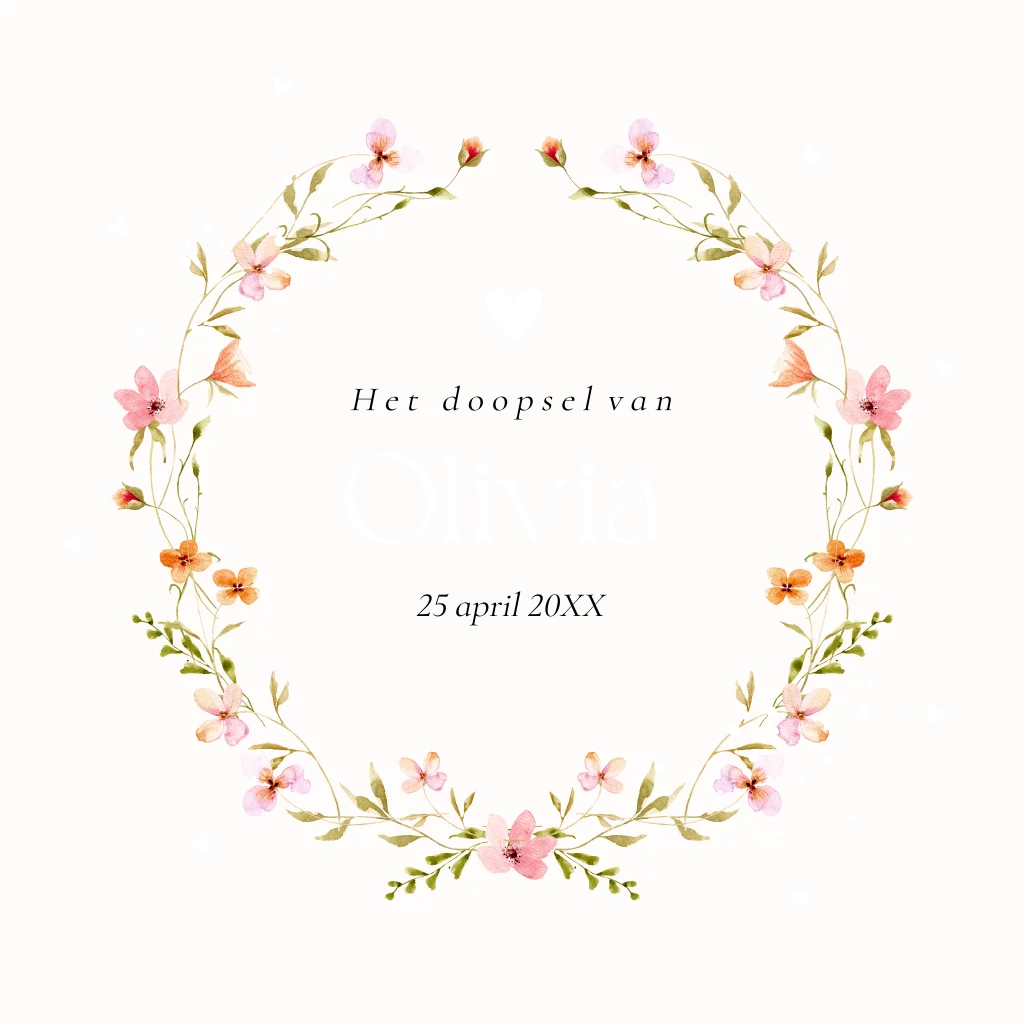 Doop uitnodiging voor een meisje wit roze met waterverf bloemen krans en goudfolie.