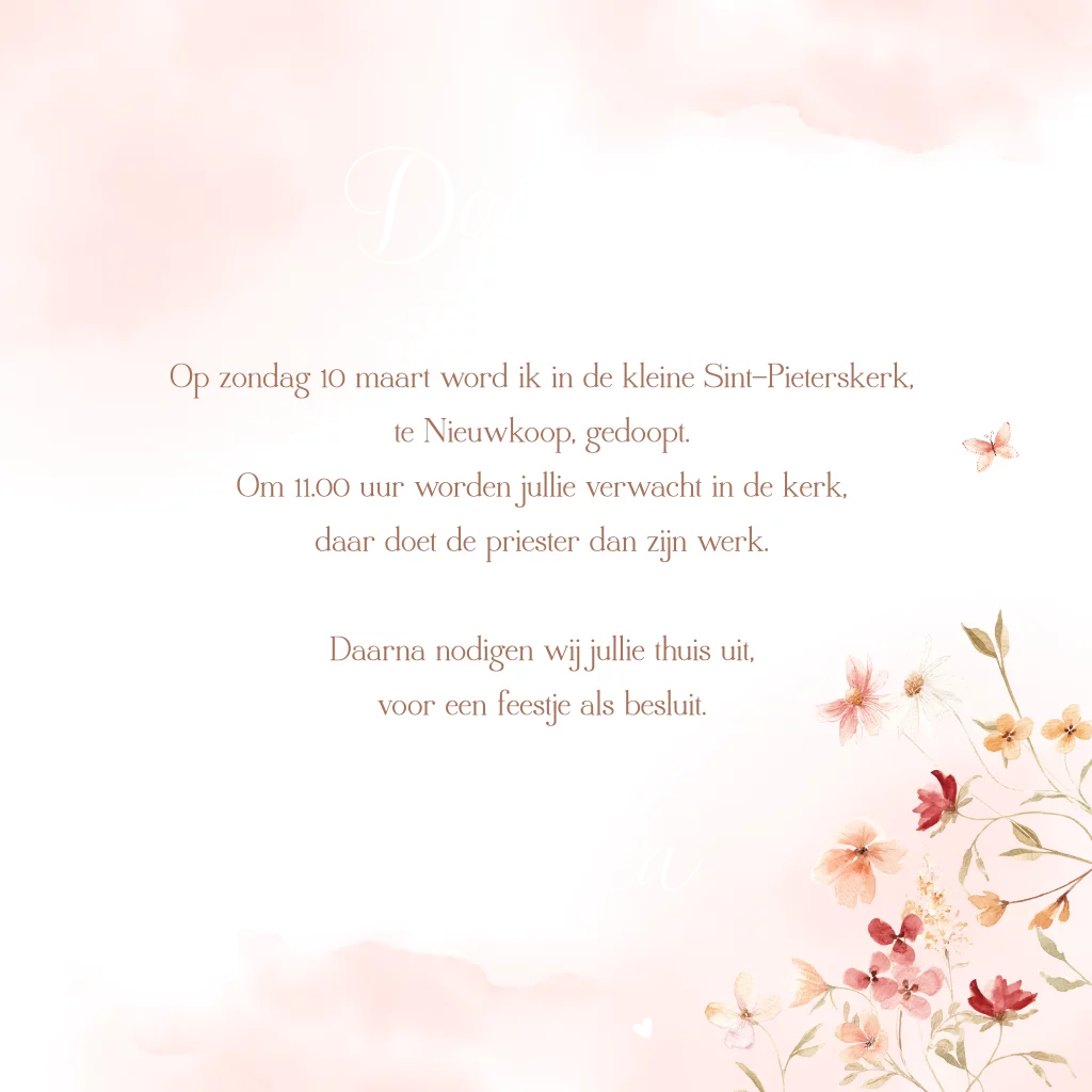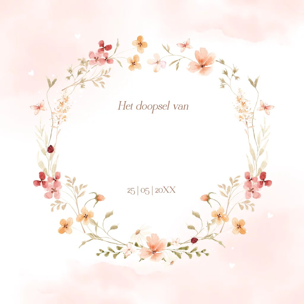 Doopkaart voor een meisje met waterverf bloemenkrans roze en goudfolie.