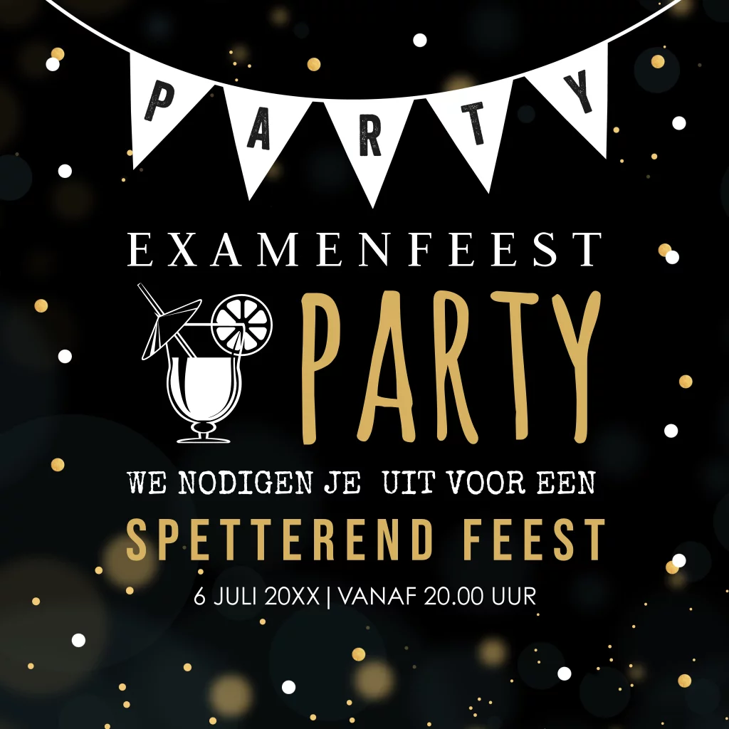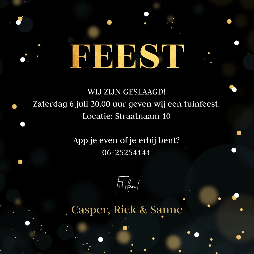 Uitnodiging geslaagd zwart & goudlook confetti. Geen goudfolie/inkt!