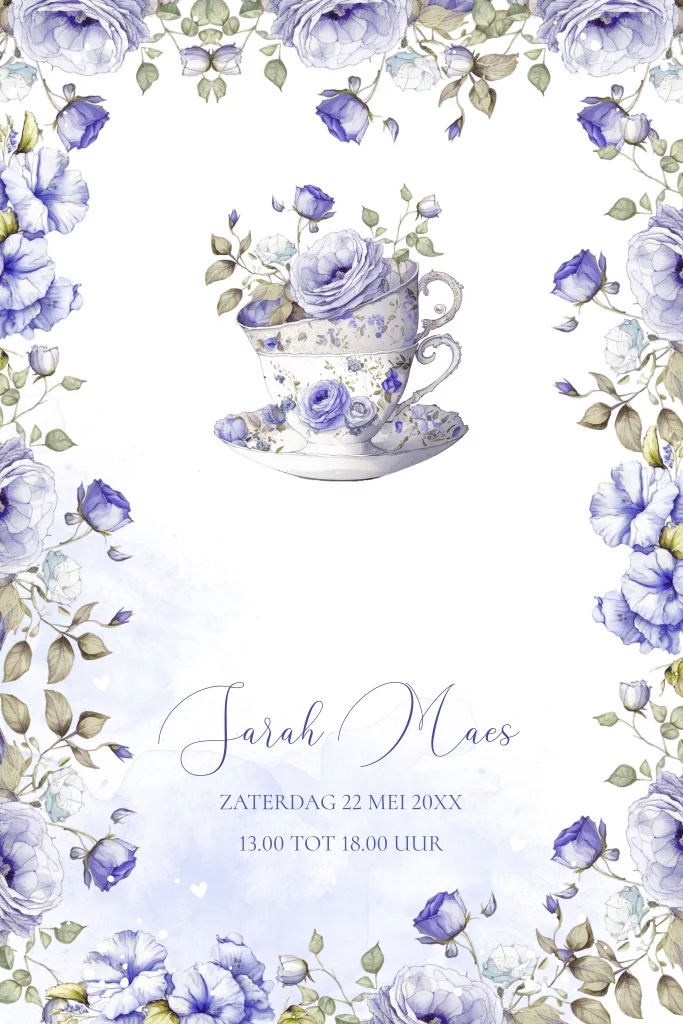 High Tea party uitnodiging blauw bloemen theekopjes goudfolie