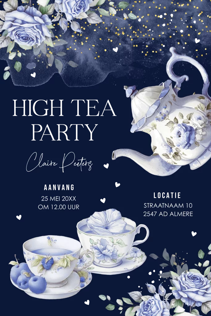 High Tea uitnodiging blauw met theepot, theekopjes, bloemen en goudfolie.