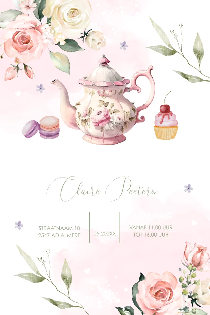 High Tea uitnodiging roze bloemen theepot rosegoudfolie