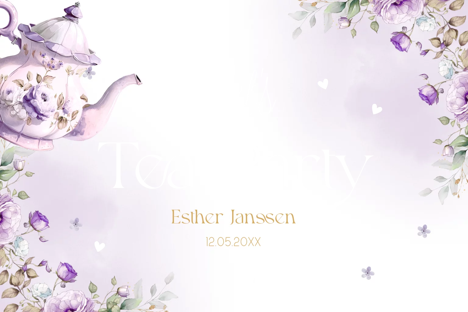 High Tea uitnodiging paars theepot watercolour bloemen goudfolie