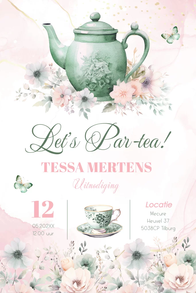 High Tea Party uitnodiging met roze bloemen, theepot en vlinders. Nodig je gasten uit met deze mooie high tea kaart!