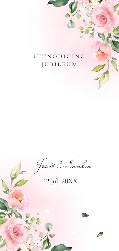Jubileum uitnodiging huwelijk langwerpig met roze bloemen en goudfolie.