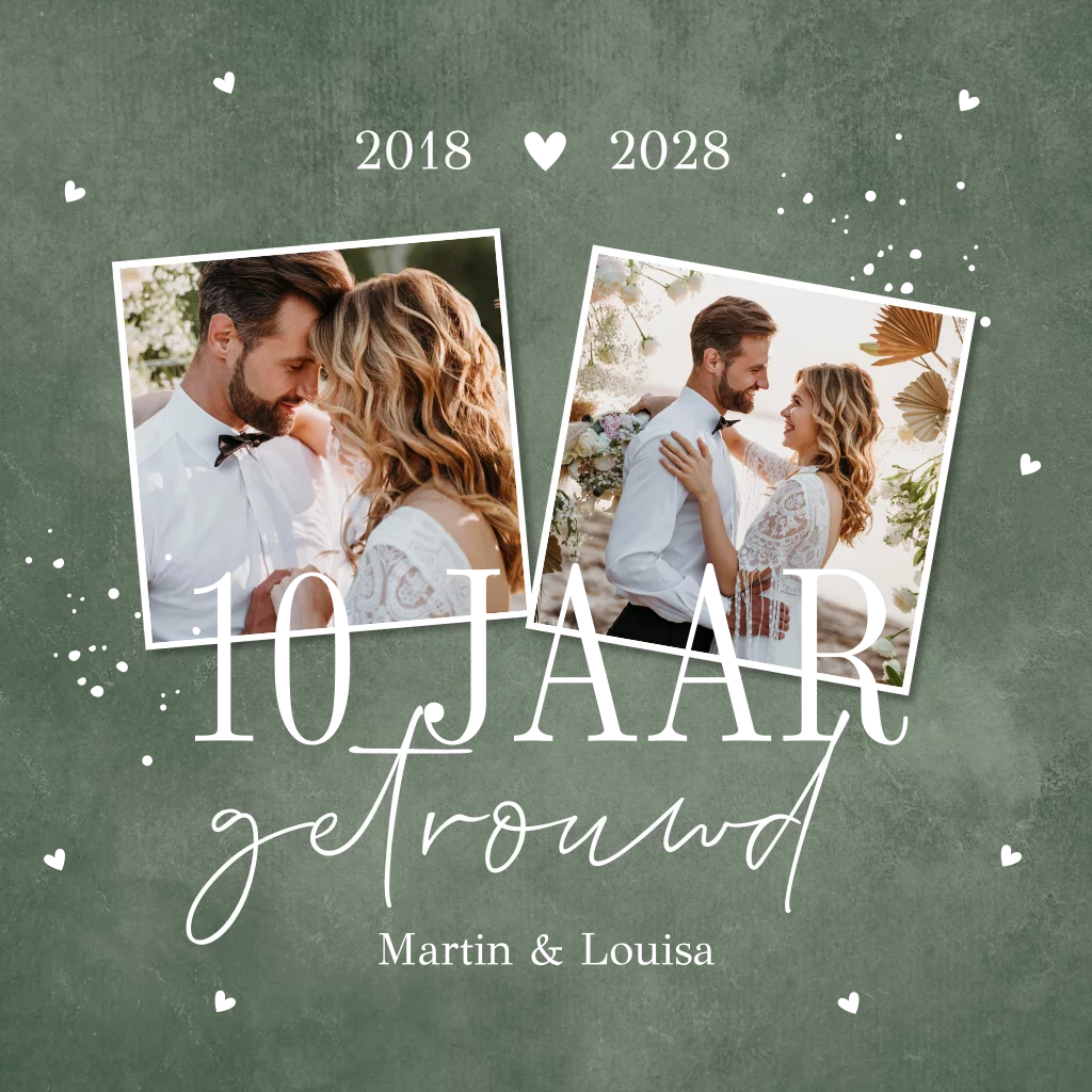 Jubileum uitnodiging groen 10 jaar getrouwd met eigen foto's en goudfolie.