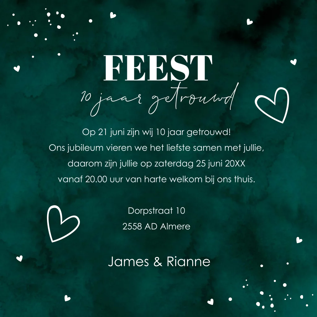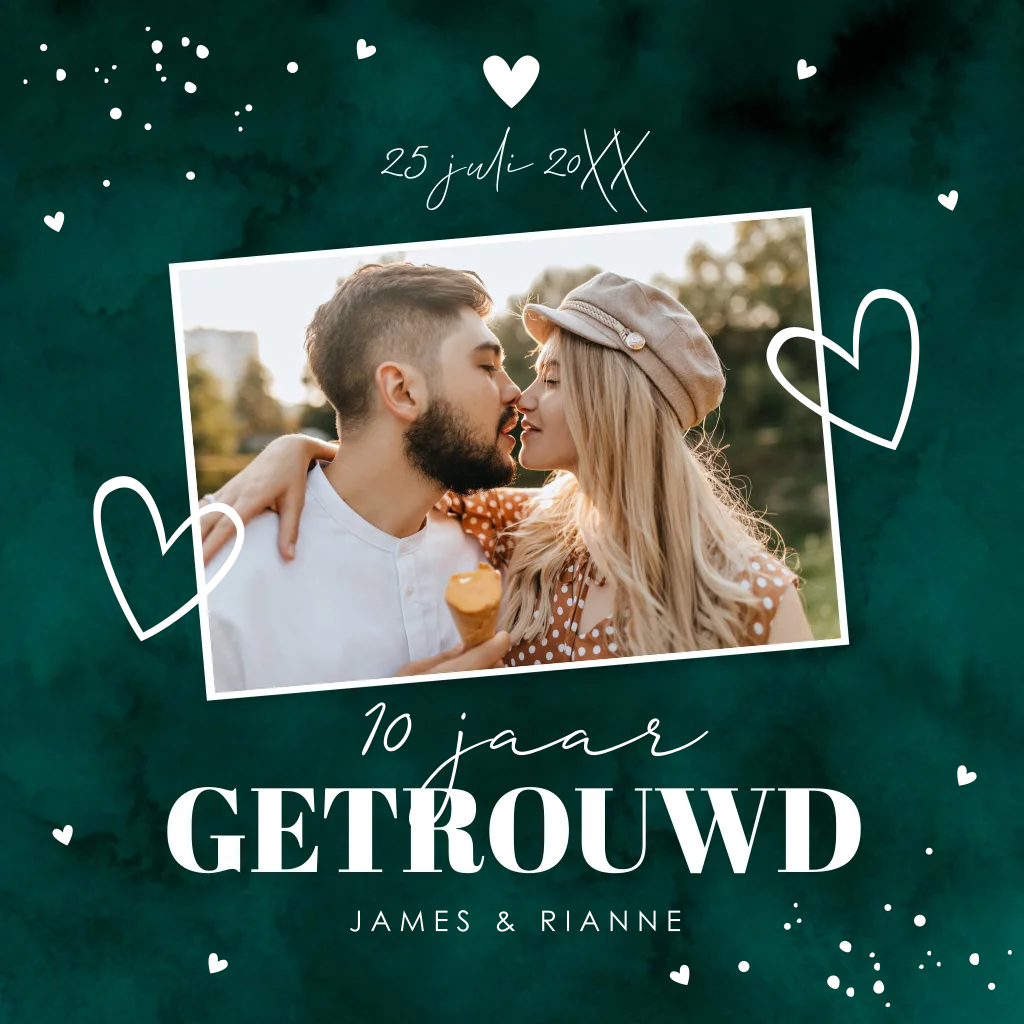 Jubileum uitnodiging 10 jaar getrouwd donkergroen met foto, hartjes en goudfolie.