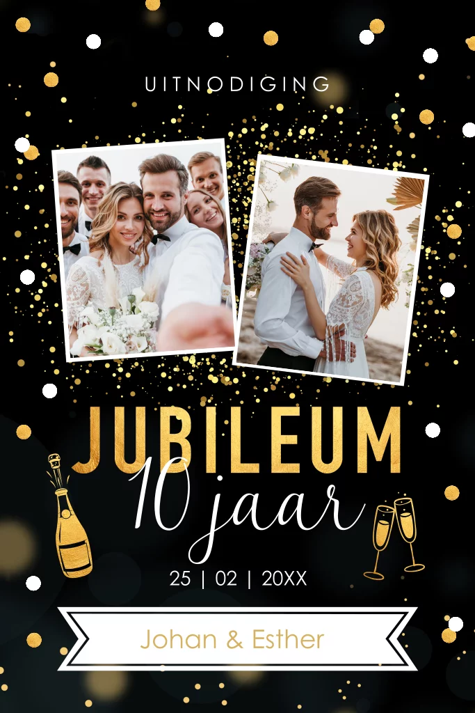 Jubileum uitnodiging huwelijk 10 jaar getrouwd zwart met foto's en feestelijke confetti.