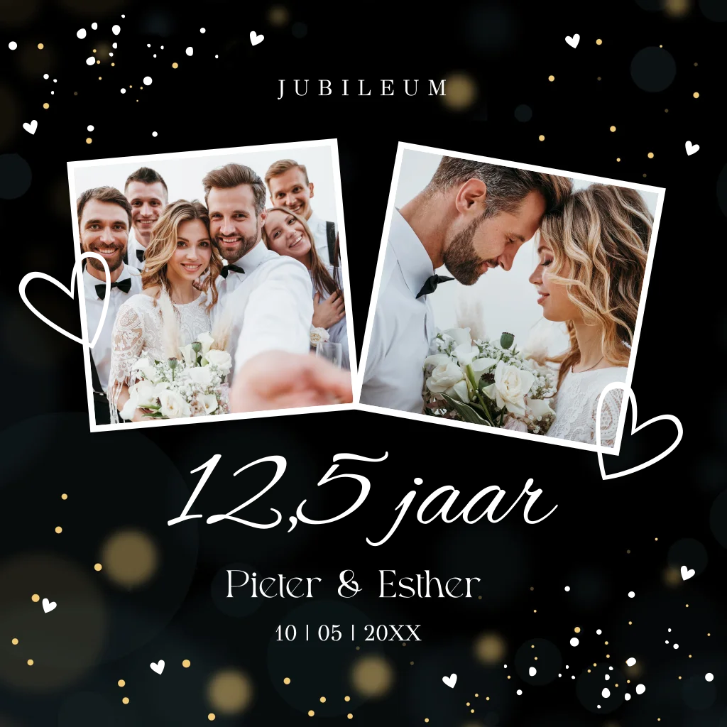 Jubileum uitnodiging 12,5 jaar getrouwd zwart met foto's, confetti en goudfolie.