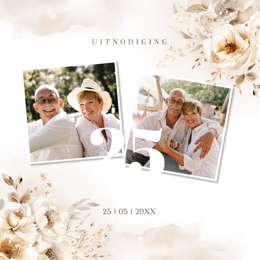 Jubileum uitnodiging huwelijk 25 jaar getrouwd beige met bloemen, eigen foto's en goudfolie. Pas het getal naar wens aan!