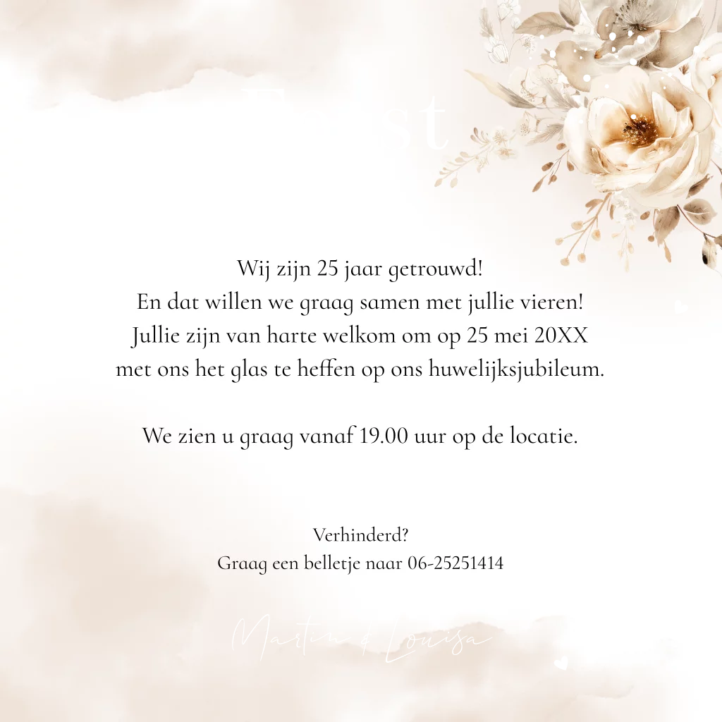 Jubileum uitnodiging 25 jaar getrouwd foto beige bloemen goudfolie