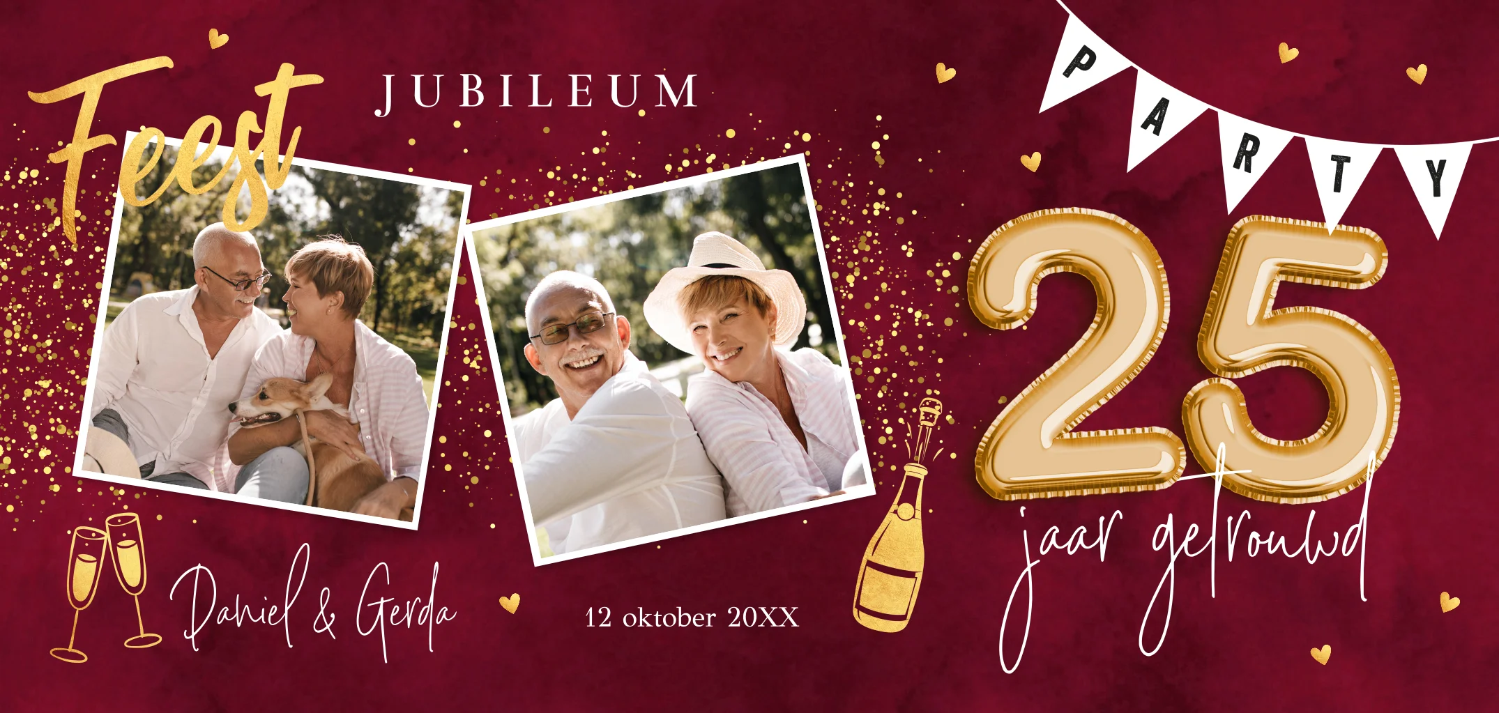 Feestelijke jubileum uitnodiging huwelijk 25 jaar getrouwd met foto's, slinger, confetti en goudlook. Geen folie!