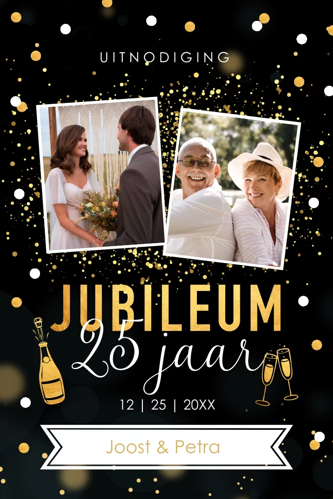 Op zoek naar de perfecte jubileum uitnodiging voor jullie 25-jarig huwelijksfeest? Deze prachtige uitnodiging met feestelijke confetti zwart is precies wat jullie nodig hebben! Met ruimte voor foto's van jullie mooie momenten samen, straalt deze uitnodiging warmte en liefde uit. De gouden accenten geven een feestelijke touch aan het geheel, perfect voor een jubileumviering.
